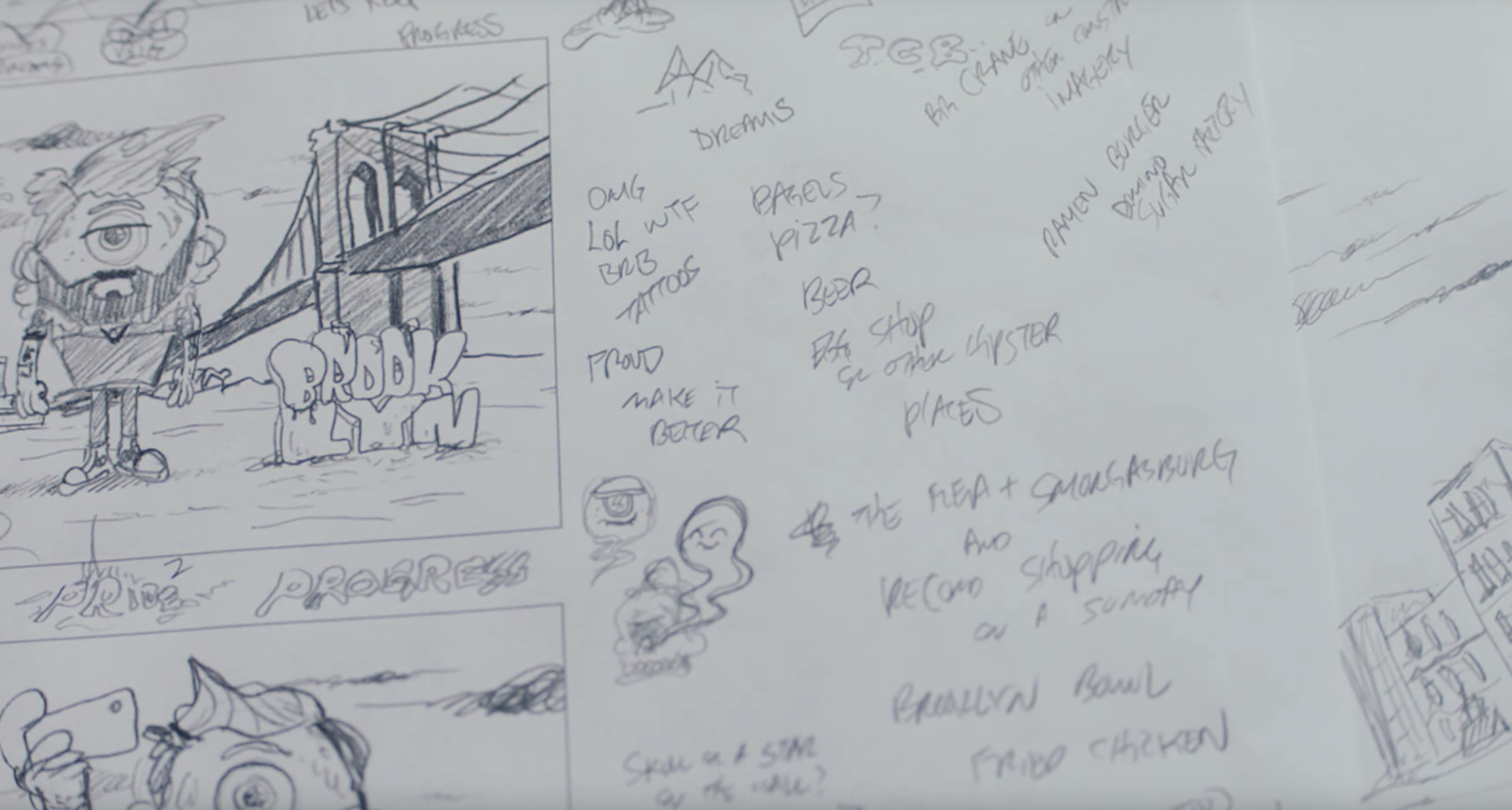 “In 2016, Miller Lite launched a marketing campaign called “Our Can, Your Canvas” which provided wall space for art. I was selected as the first artist for this campaign, and the location they chose was Williamsburg. The brief was very open: a black and white portrait of Brooklyn. Since I live in Brooklyn, and I love drawing black and white line work, this was a perfect fit. Brooklyn is the largest borough in NYC and incredibly diverse, so I chose to focus on the characters in Williamsburg that would likely encounter this mural. So here you’ll find 3 hip characters with iconic Brownstone buildings, construction cranes, pizza and the words “Stay True.” Like all projects I take on, I used ink with a brush and smooth paper to create the artwork and then finessed a few things on the computer. The agency provided two professional painters to execute the mural and I was on hand to oversee the process. For the short amount of time the mural was up, local bars received beer glasses, shirts and coasters to give away. This was a great project to work on and I’m happy to represent my neighborhood!”- Buff Monster